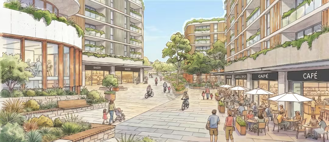 You should know that this picture doesn't have any relevance to the master plan. It's just an artists rendering of what a generic communal area would look like, but this doesn't stop Council using it as the salient image on the project's page. The detailed visual designs for the new shopping village don't exist yet, they can't, you don't waste money designing it when you can't legally build it because the FSR is too low.